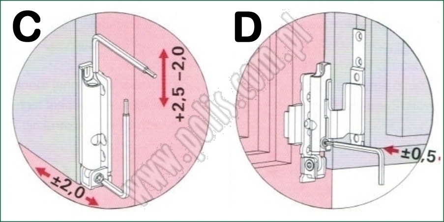 W przypadku oporów występujących na pionowych elementach okna należy regulować położenie skrzydła w osi poziomej. W tym celu wkręcamy lub wykręcamy śrubkę w dolnej części zawiasu / rysunek C /. I w tym wypadku róbmy to stopniowo sprawdzając efekty regulacji. Musimy jednocześnie pamiętać, że przesuwając skrzydło w poziomie dołem powinniśmy o tą samą wielkość przesunąć je górą / rysunek A / w przeciwnym wypadku skrzydło okienne ustawimy skośnie względem ościeżnicy / futryny /.